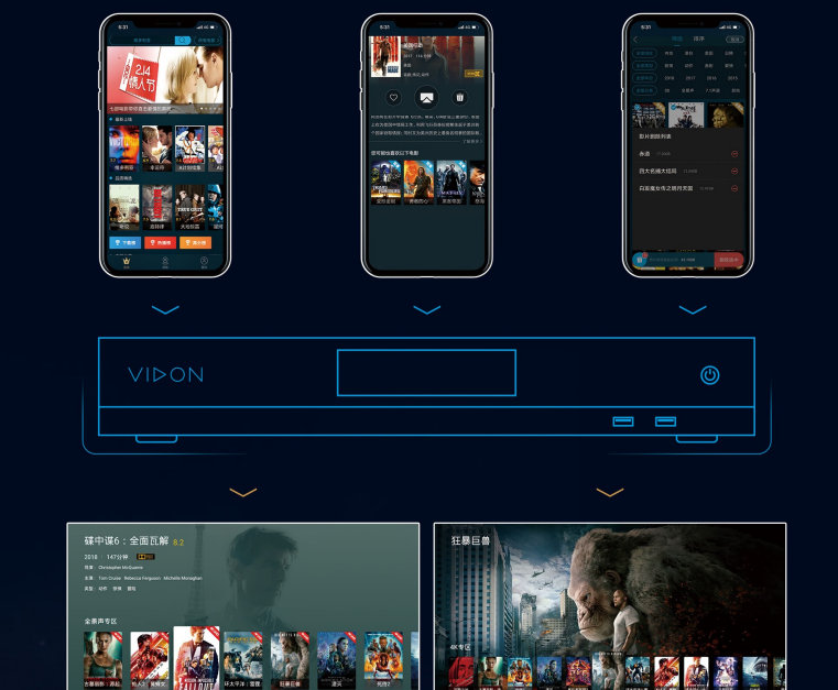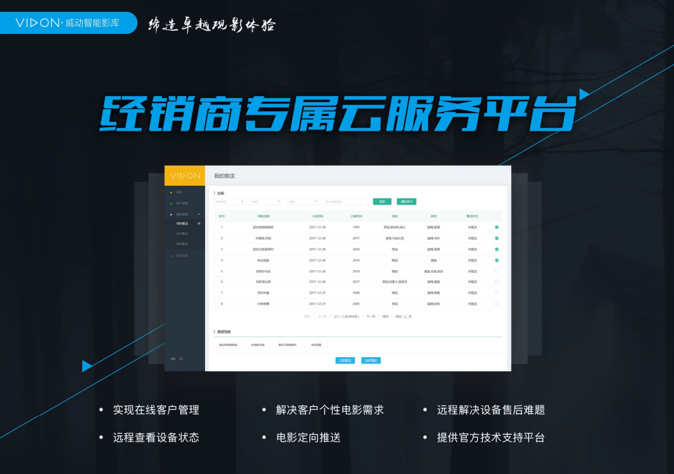 威動智能?影庫研發之初,就針對高品質影片需求進行架構設計,提供了從高品質的影片一鍵下載到播放一體化的解決方案,更有經銷商云平臺,給終端客戶帶來全新的個性化VIP服務。