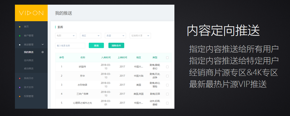 影音集成商可通過經銷商云平臺定向推送影片至終端用戶,無需用戶操作,一鍵推送并自動下載,可根據云片庫提供的影片進行運營規劃,滿足用戶的定制內容需求,提升自身的運營實力,實現個性化運營。